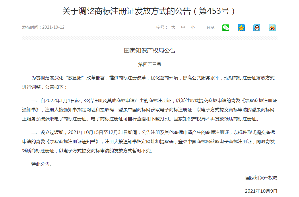 二、设立过渡期,2021年10月15日至12月31日期间,公告注册及其他商标申请产生的商标注册证,以纸件形式提交商标申请的寄发《领取商标注册证通知书》,注册人按通知书指定网址和提取码,登录中国商标网获取电子商标注册证,同时寄发纸质商标注册证;以电子方式提交商标申请的发放方式暂时不变。