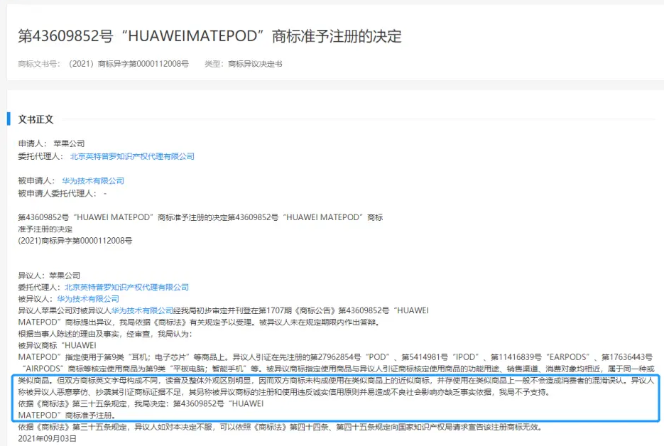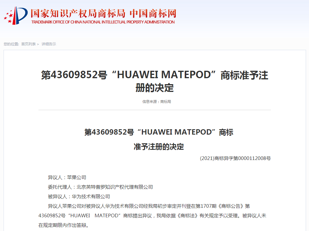 近日,爱网互联了解到,商标局发布了一则关于华为申请的“HUAWEI MATEPOD”商标的异议决定书。