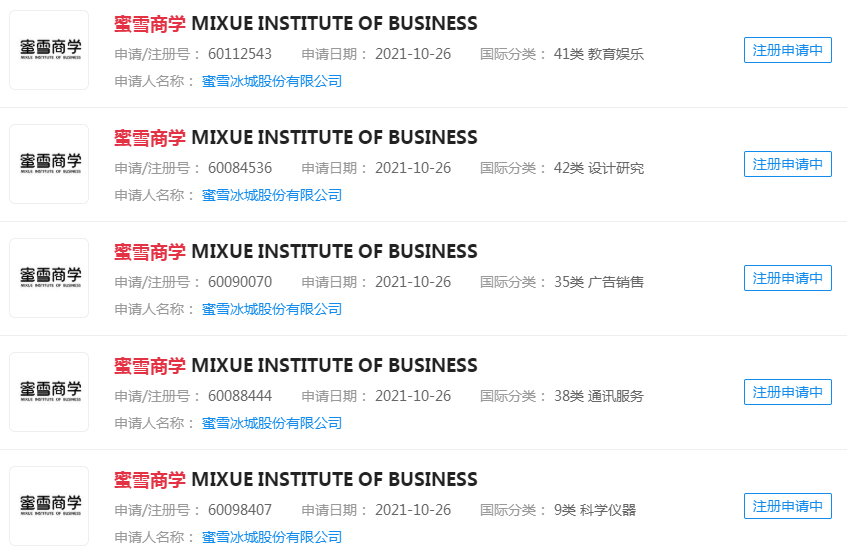 爱网互联查询了解到,“蜜雪商学”“MXIB”商标注册在广告销售、教育娱乐、网站服务等类别,商标状态均为申请中。