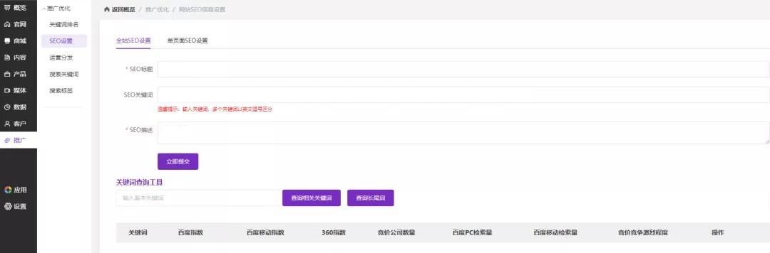 支持友情链接设置,搜索标签设置,搜索关键字排名监控分析,运营分发,显示运营人员为用户分发的外链,可以针对单个页面的TDK进行增删编辑,支持批量删除页面的TDK。其中页面分为PC端、移动端,支持双端同步/异步设置TDK。